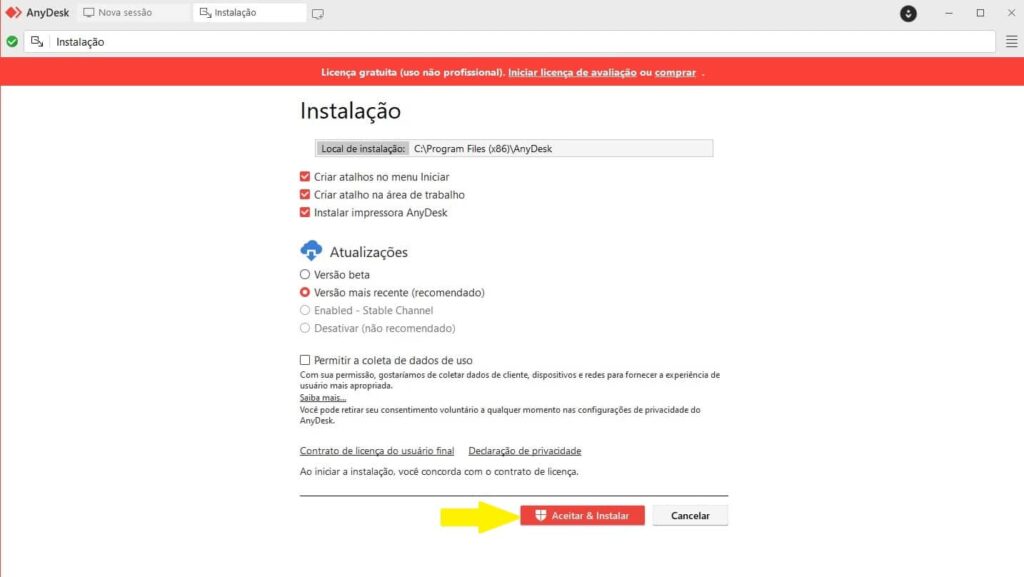 8. Em seguida, clique em “Aceitar e instalar” para instalar o Anydesk no computador.
